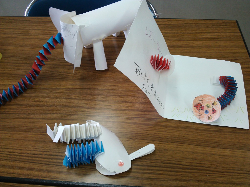 紙テープをバネのように折り、それを利用した作品を作りました。