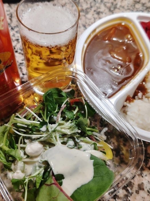 明日に備えお酒は控えめに、ビール1本とカレー+サラダのホテル飲み。